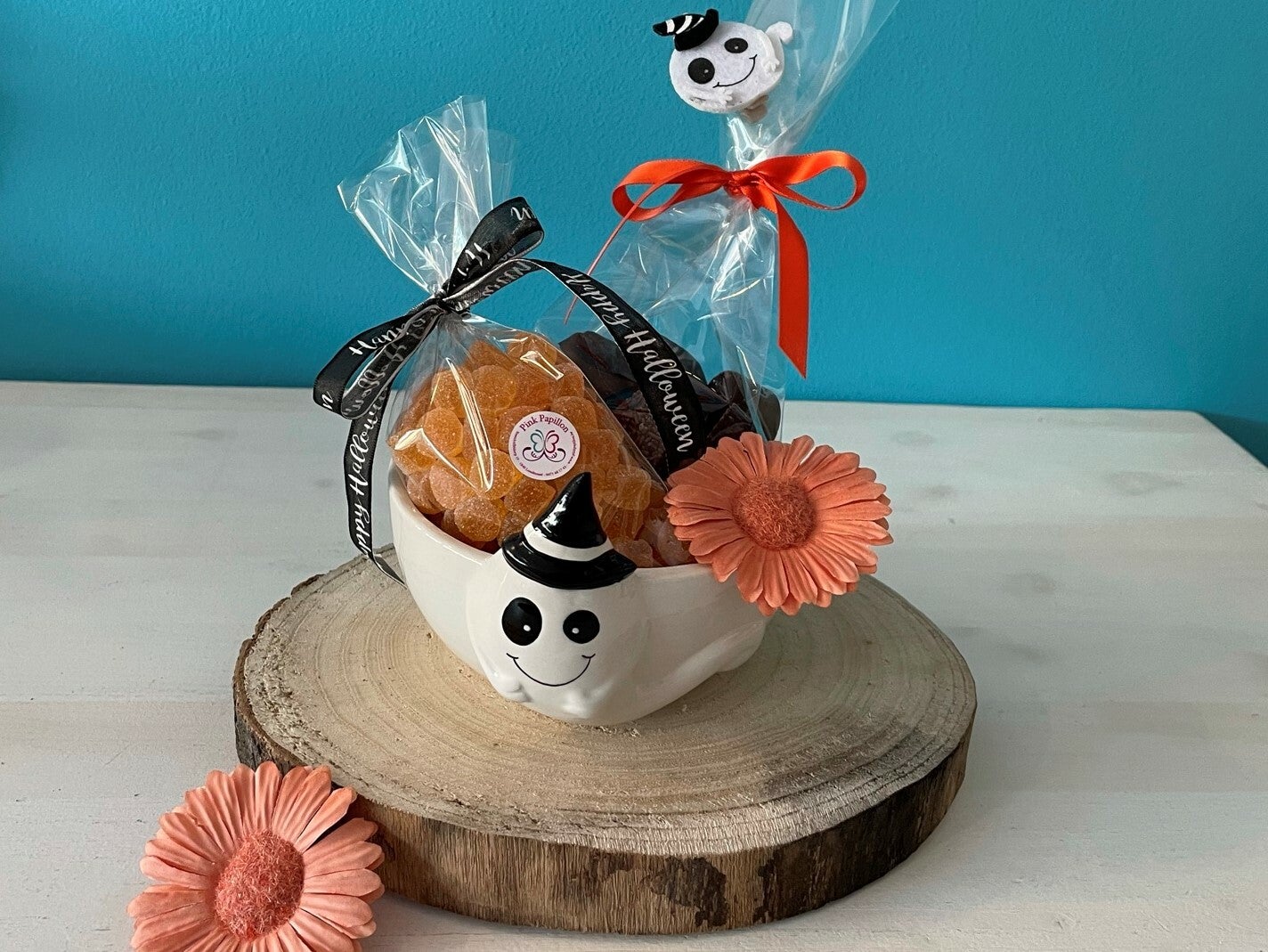Spooky kom gevuld met lekkere sinaas snoepjes - 200 gr en verse, huisgemaakte pralines - 250 gr